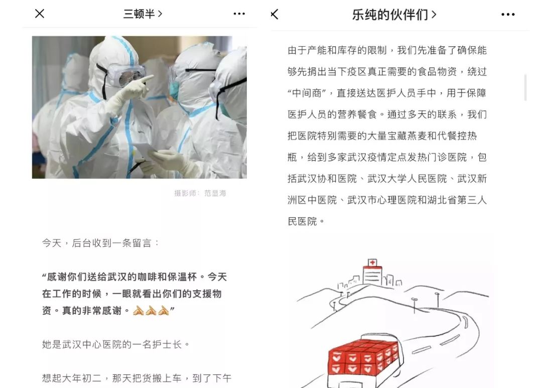 比如咖啡界的年轻品牌三顿半,在公众号就公布了他们将咖啡和保温杯送给战斗在武汉一线的医护人员们的推文。暖心的文章得到了许多用户的瑞思拜。