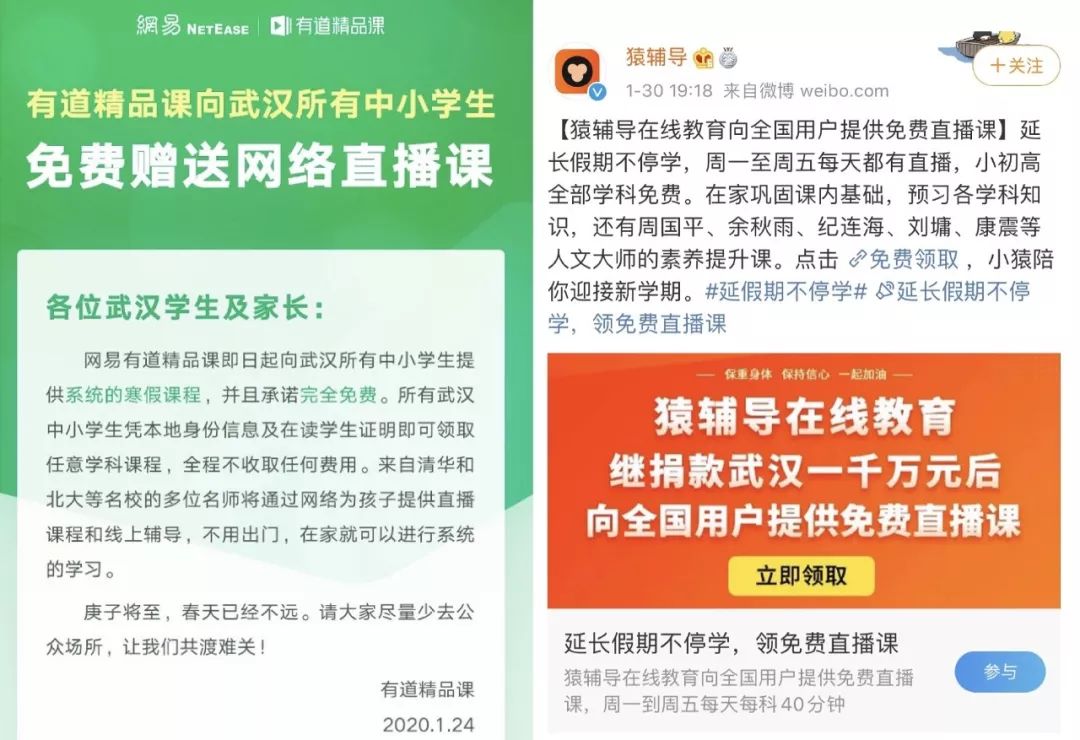 猿辅导、学而思网校等机构也紧随其后,还加福利加码,将免费学习课程的范围扩张到全国中小学生。