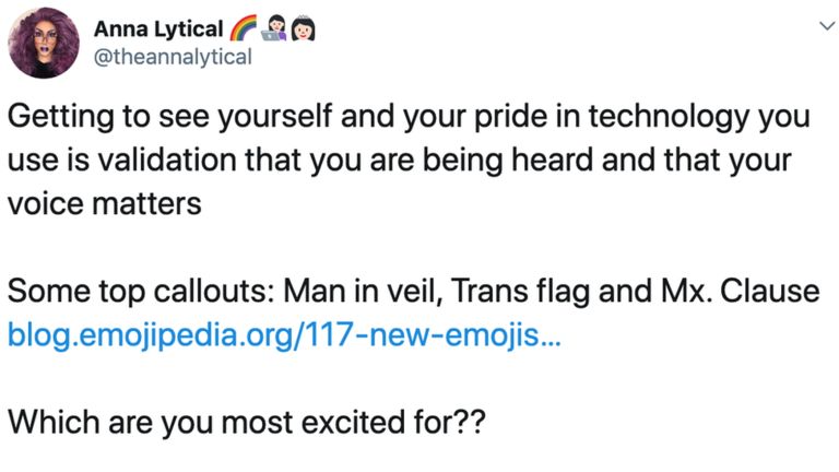 自称是扮装皇后的Anna Lytical认为,新的表情符号代表了更广泛的人群,并向边缘化人群发出了声音。但是也有人抱怨道,新的表情符号还没有包含足够的种族多样性,应该包含混血家庭和更多发型的象征。