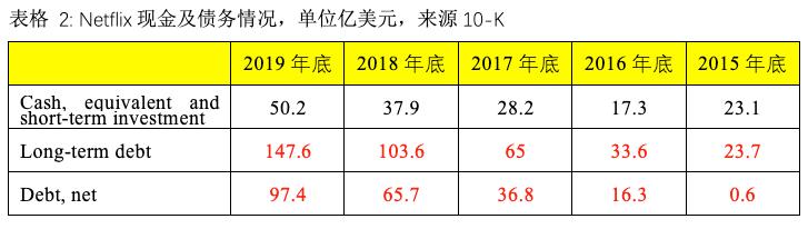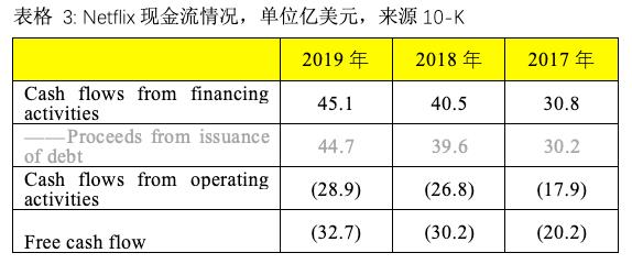表3中可以看出,在Netflix每年的融资活动现金流中,几乎全部是靠发债即长期票据完成(灰色字体),且债务越筑越高,这也是避免股权融资方式对现有股东的稀释。Netflix最近一次发债是去年10月发行的20亿美元高级票据,10-K的附表显示其利息率处于历史低位。这表明它现在的融资成本比较低,但不排除未来利率变动对融资成本的影响。表3中的括号表示负数,Netflix经营活动现在还不能产生正向现金流,而且现金流出是逐年增加的,再加上每年的固定资产支出,自由现金流自然也是负数。