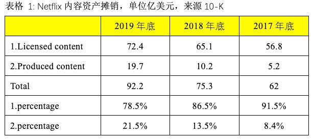 以Netflix为例,表1列出了其每年摊销的内容资产金额,注意这里不是总的内容资产,而是当年截至年底时的摊销额。可以看出自制内容资产的占比提升明显,这一比例已经超过20%,这是Netflix的策略选择,腾讯视频与爱奇艺也是类似,越来越倚重自制内容,但眼下仍主要靠外购版权填充内容库存。