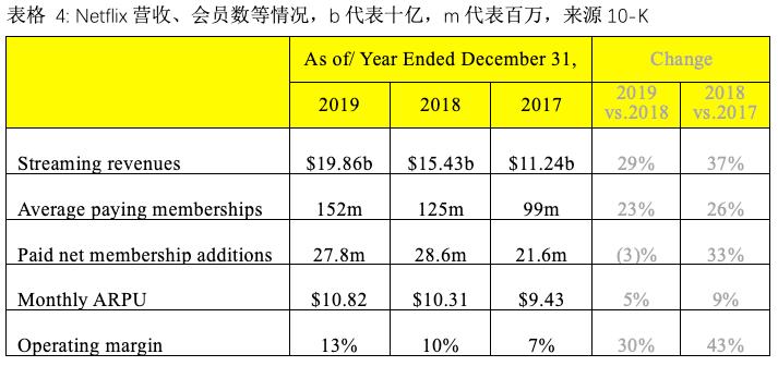 这种持续的大手笔烧钱换来了什么呢?主要看三点:营收增速、付费会员数增加量、ARPU单用户价值变化。表4通过对比2019和2018、2018和2017发现,Netflix的流媒体收入、年平均付费会员人数、付费会员增加值、单月单用户付费额,以及经营利润率这五项的增速均出现下滑,说明2019年的业绩增速普遍不如2018年。