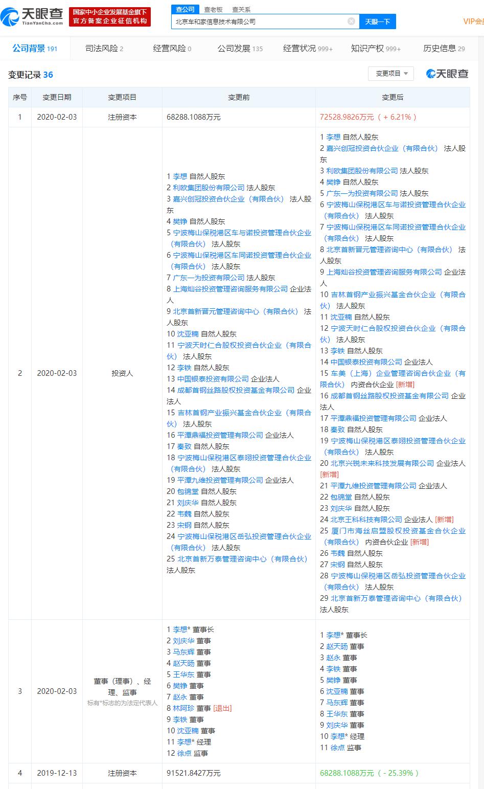 36氪获悉,天眼查数据显示,2月3日,北京车和家信息技术有限公司发生工商变更,新增四位股东,包括中金资本的投资实体之一厦门市海丝启盟股权投资基金合伙企业(有限合伙)、北京王科科技有限公司、北京兴锐未来科技发展有限公司以及龙珠资本旗下的车美(上海)企业管理咨询合伙企业(有限合伙)。此外,林阿珍退出公司董事,其注册资本也从约6.83亿增至约7.25亿,增幅为6.21%。