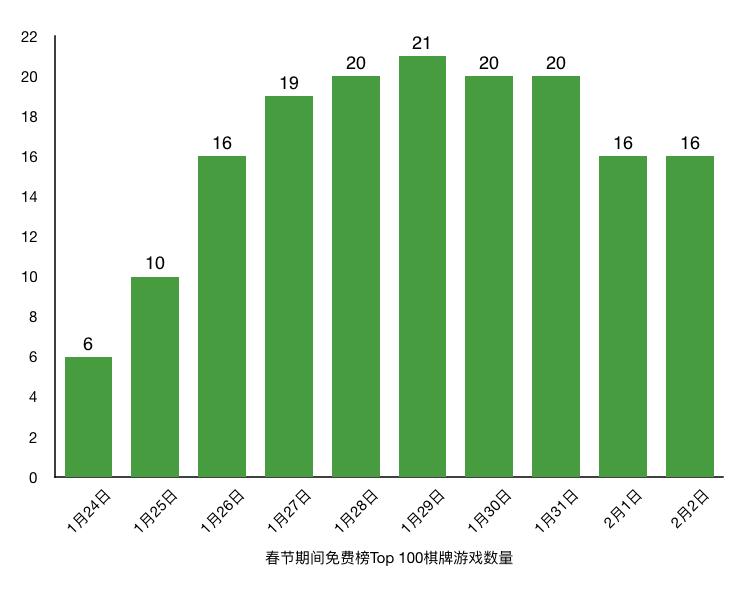 在1月24日除夕节当天,尚且只有6款棋牌游戏入围Top 100,但自正月初一开始,棋牌游戏呈现出集体上涨的势头。随后的五天,分别有10款、16款、19款、20款、21款棋牌跻身榜单,并在正月初五迎来最高点。