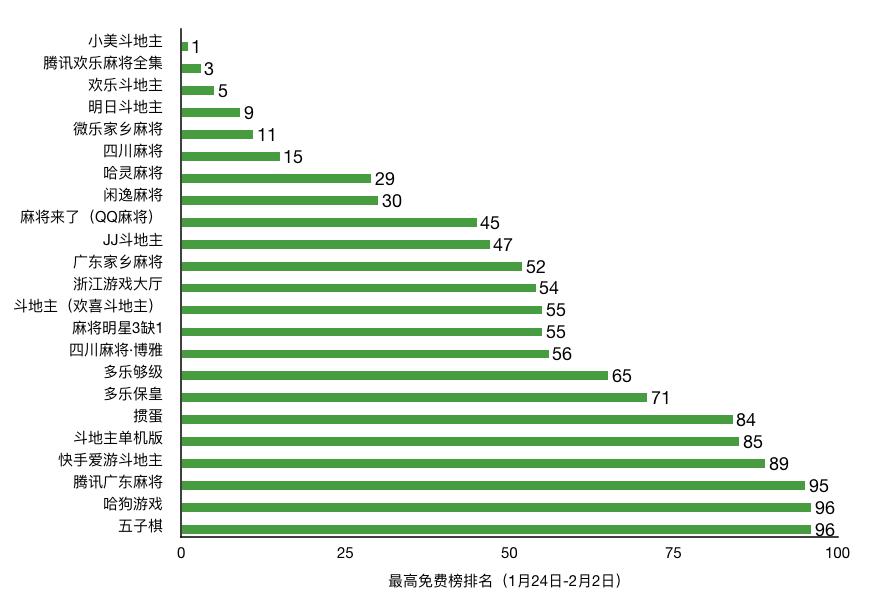 葡萄君对曾入围过免费榜Top 100的棋牌游戏做了更详细的名次统计。如下图所示,姚记扑克旗下《小美斗地主》为春节档最大黑马,一度登顶免费榜;腾讯两款棋牌之后,地方棋牌受到热捧,《微乐家乡麻将》、《四川麻将》、《哈灵麻将》等均做到过免费Top 30。