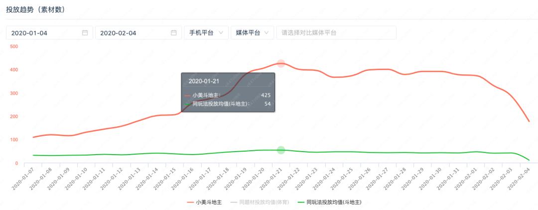 过去一个月,《小美斗地主》的投放力度大幅提升,尤其在春节前一周密集推广,1月21日当天投放素材数是425,约为同玩法投放均值的8倍。今日头条、抖音短视频、西瓜视频等渠道是主要的投放媒体平台。