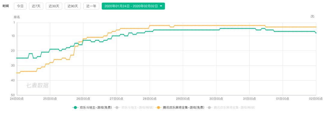 免费榜排名对比,黄色为《腾讯欢乐麻将全集》,绿色为《欢乐斗地主》