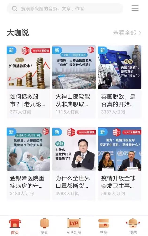 中读App首页“大咖说”专题中,完整显示的6个音频节目中5个都与新冠肺炎相关。而在“如何理解中国”付费专题中,最新上线的《新冠肺炎预防全攻略》节目,向用户免费开放订阅。