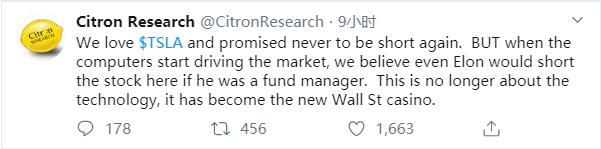 虽然做空者目前损失惨重,但不少机构仍认为特斯拉股票有做空价值。美股著名空头香橼研究(Citron Research)周二盘中发布对特斯拉的最新看空消息。香橼研究表示,虽然我们曾承诺不会再做空特斯拉,但当散户开始驱动市场,相信如果马斯克是基金经理,现在也会做空这只股票。“这和技术再也没有关系,特斯拉已经成为新的华尔街赌场。”