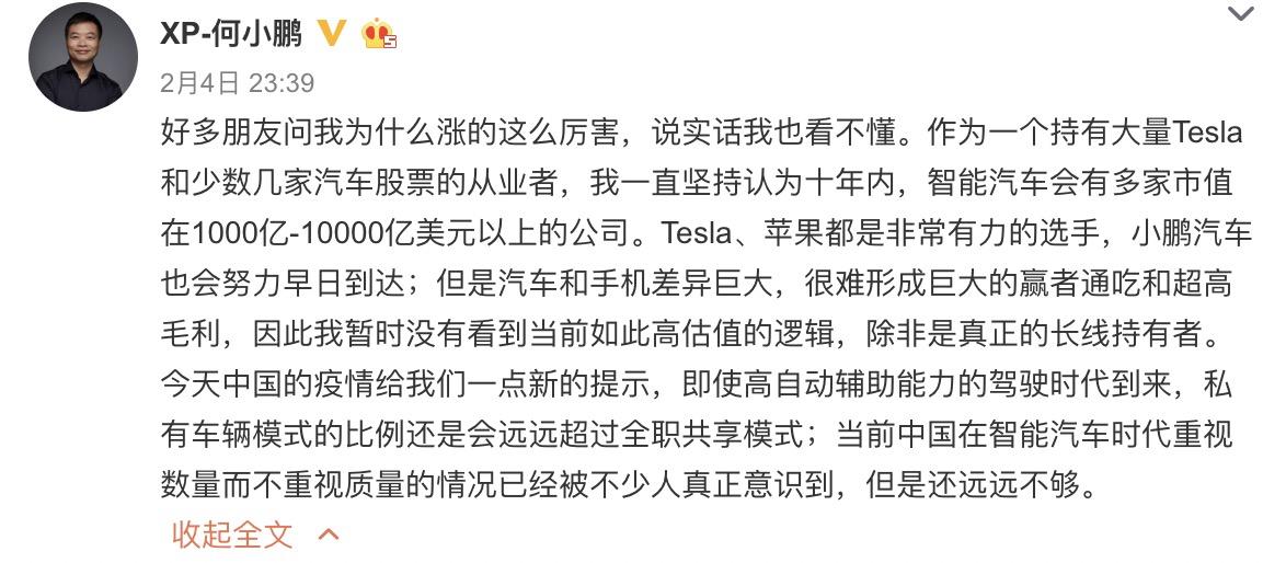 小鹏汽车CEO何小鹏在2月4日晚间发布微博,表示“没有看到(特斯拉)当前如此高估值的逻辑”。何小鹏称自己持有“大量”特斯拉和少数几家汽车股票,但是汽车和手机差异巨大,很难形成巨大的赢者通吃和超高毛利,因此暂时没有看到当前如此高估值的逻辑,除非是真正的长线持有者。