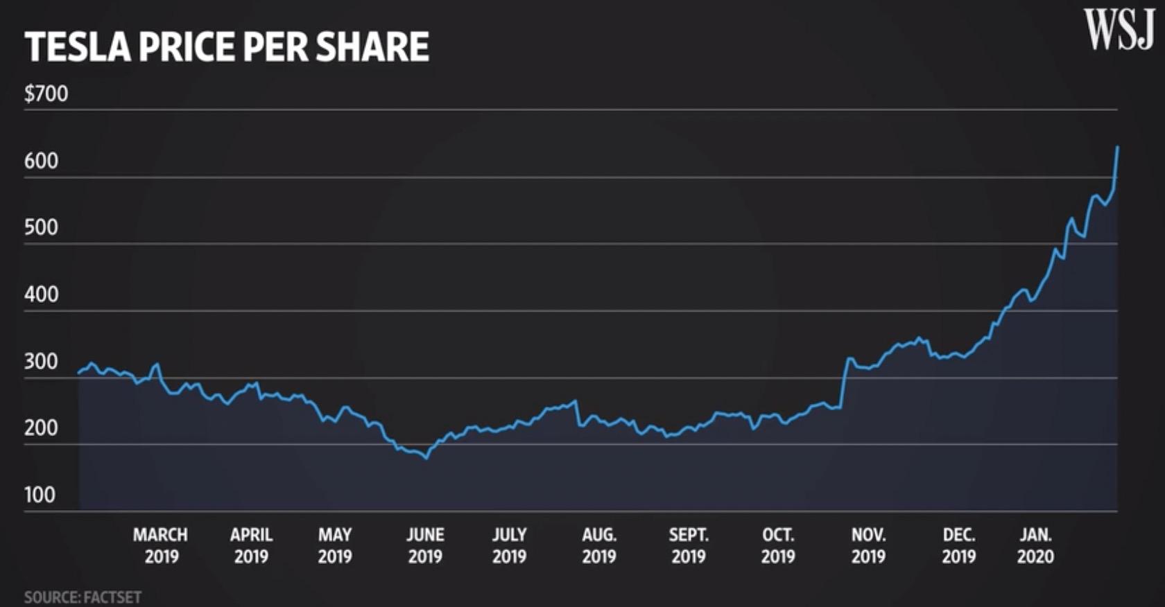 2019年3月至2020年1月特斯拉股价走势 来源:华尔街日报