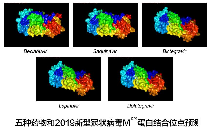 上述联合科研团队针对2019新型冠状病毒的多个靶标蛋白(其中Mpro 蛋白晶体结构由中科院饶子和院士团队提供),对8506种上市或者正在进行临床试验的药物中进行超大规模计算机辅助药物筛选工作,并在一周内取得了第一阶段成果。研究发现,有五种药物可能对2019新型冠状病毒有效,分别是Beclabuvir,沙奎那韦(Saquinavir),比特拉韦(Bictegravir),洛匹那韦(Lopinavir),多替拉韦(Dolutegravir)。