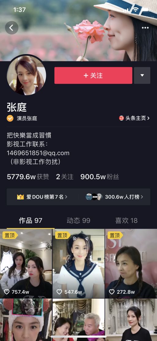 近几年都没有影视作品的70后演员张庭尽管当年也是红极一时,但如今恐怕已经被90后遗忘,95后、00后更可能对其根本没有认知。然而,在抖音上,张庭已经积累了900多万粉丝,发布的97个短视频中,大部分都获得超10万的点赞量,在抖音爱DOU榜上也常常名列前茅。