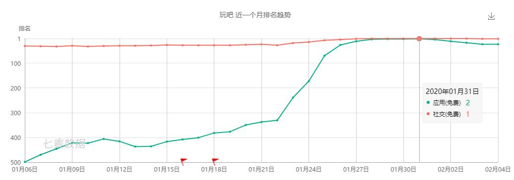 轻游戏的走俏也拉动了小游戏聚合平台的走势,聚集了“你画我猜”、“狼人杀”、“剧本杀”等社交互动游戏的“玩吧”表现抢眼。原本在免费榜排名400名开外的它,春节期间排名持续上升,1月31日登上免费应用榜第2名,同时也是社交类APP第一名。与Steam一样,骤然涌入大量用户一度导致玩吧服务器崩溃,#玩吧崩了#同样登上热搜榜单。