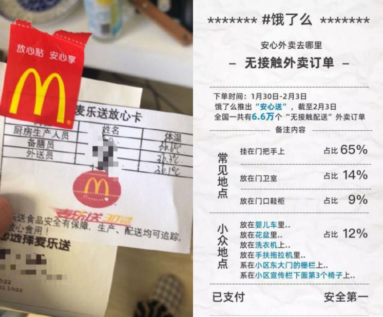 即配送人员佩戴口罩、每天测量体温,产品直接投放到指定地点,不与客户面对面接触。