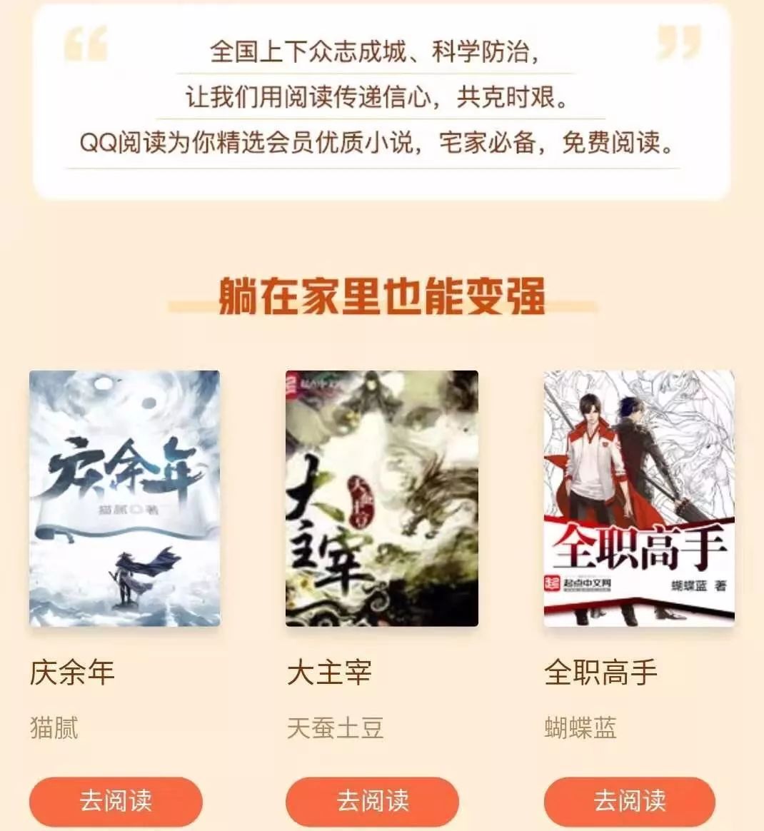 阅读一向是春节标配,尤其是疫情导致人们足不出户的时间延长,许多网文平台也趁机推出相关方案来刺激留存时长和用户增长,如QQ阅读送出800万份14天的会员,掌阅”APP上线免费专区,针对湖北读者免费推送100万份掌阅APP月卡VIP;粉瓣书城”、栀子欢”也上线免费阅读专区......对于春节宅家的读者而言,无疑也是一次利好。