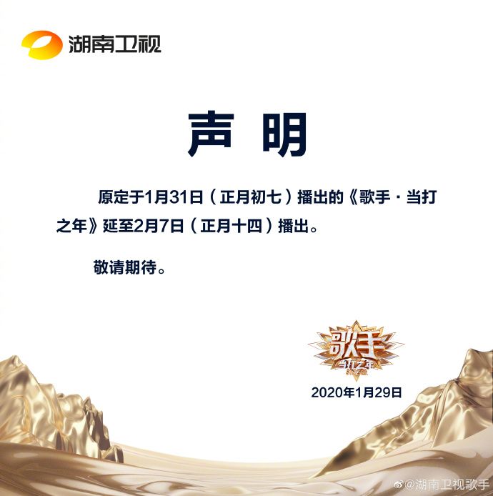 网络上流传的一则通知显示,2月6日录制的《歌手·当打之年》将取消现场观众,改为芒果TV网络投票;湖南卫视《元宵喜乐会》更名为《元宵一家亲》,为湖北武汉加油,并将用直播连线湖北抗疫一线“最美逆行者”。另外,晚会确保疫情防护工作严密到位的同时,首次取消现场观众的设置。
