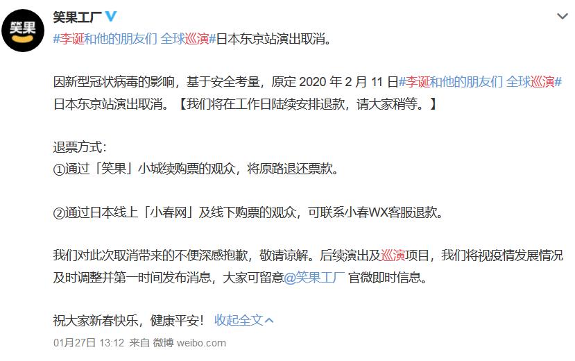 2019年度爆款综艺衍生出的线下演出,也相继取消。2 月 11 日“李诞和他的朋友们”全球巡演日本东京站演出取消 ,票款已经陆续退还;2月21日举办的《乐队的夏天HOT巡演-北京站》也将延期举行,举办时间将根据疫情动态及相关部门要求另行通知。