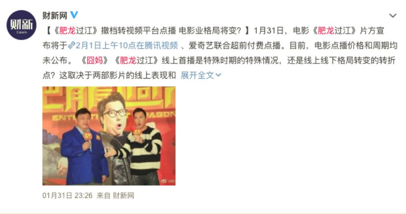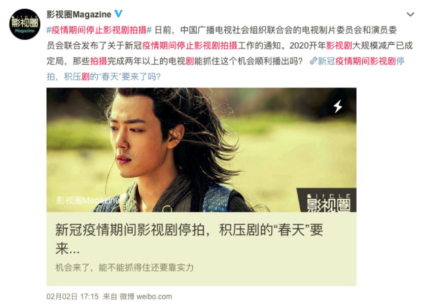 项目停滞、延后开机,疫情带来的一系列“蝴蝶效应”或许会为影视行业带来小半年的阵痛期。由于疫情的影响,今年的春节档、情节人节档电影全部撤档,《囧妈》、《肥龙过江》转为“网大”,这严重影响了影院和片方的营收。在剧集方面,正在热播的剧集也不敢大肆宣传,微博热搜频频被疫情相关消息占据,很少有剧集能够在此时获得关注。