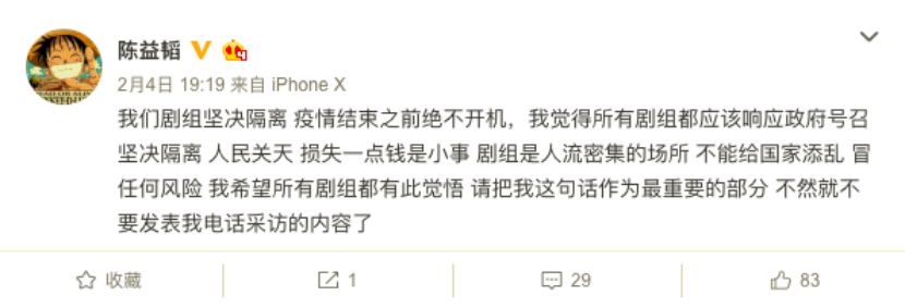 《清落》的总制片人陈益韬坚定地对记者说:“我们剧组坚决隔离,疫情结束前绝不开机,我希望所有剧组都应该响应政府号召,坚决隔离。损失一点小钱是小事,剧组本来就是人流密集的场所,我们现在能做的就是不给国家添乱,不冒任何风险。”
