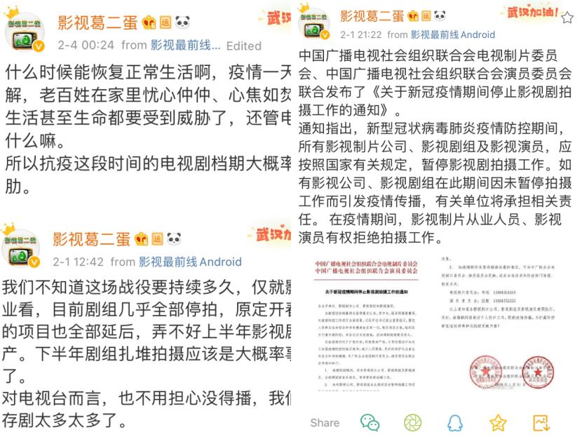 肺炎对影视行业最直观的影响便是横店、无锡、象山等影视城暂停开业,《有翡》、《大江大河2》、《传家》等正在热拍中的影视项目不得不停机整顿,随之而来的便是较大的经济损失,尤其是一些投资高额的头部项目,停机一天就要承担100多万的亏损,这对于影视投资人来说无疑压力巨大。
