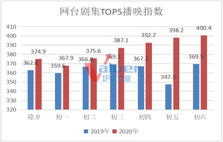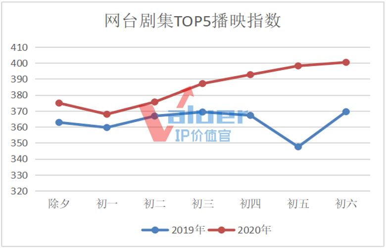 2020年春节期间,每日播映指数TOP5的剧集播映指数整体走高,峰值突破400,比去年同期高出30.5,平均值达到77.05,高出去年同期不少,70以下的占比只有10%。与此同时,与去年同期相比,2020春节期间没有出现“一剧独霸”的现象,《锦衣之下》《爱情公寓5》《热血同行》《三生三世枕上书》《下一站是幸福》等新上IP剧集平分秋色,整体“携手并进”。