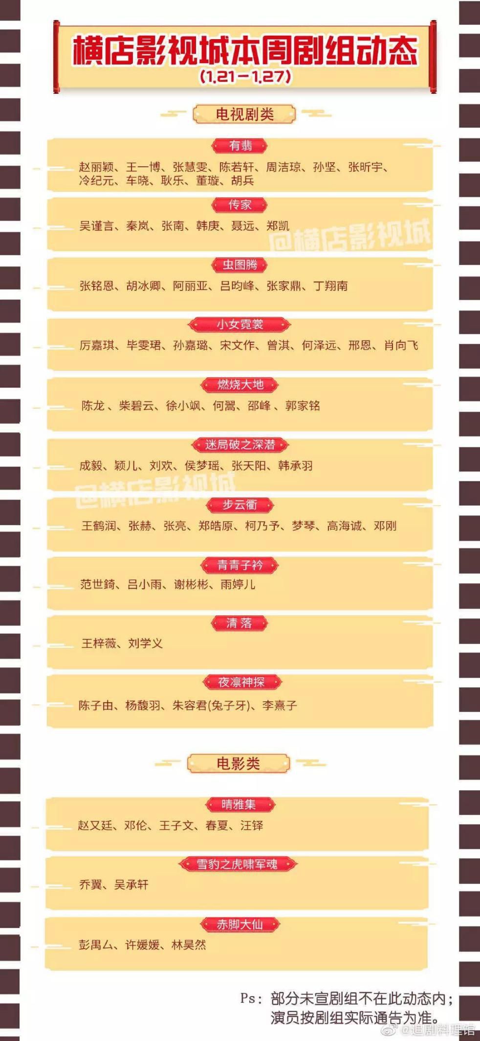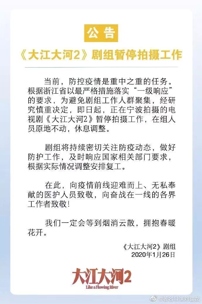 从1月26号《大江大河2》宣布停拍开始,陆续有剧组发布停拍公告。1月31日,中国广播电视社会组织联合会电视制片委员会、演员委员会联合下发了《关于新冠疫情期间停止影视剧拍摄工作的通知》,要求新型肺炎疫情期间,所有影视制片公司、影视剧组及影视演员暂停影视剧拍摄工作。