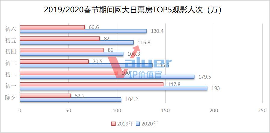 院线市场新模式凸显,传统网大也迎来了契机。由于“宅家躲疫”,网大也成为不少人消遣的方式。IP价值官统计显示,今年春节期间每日TOP5票房影片分账总收入达到2418.5万元,与2019年的1512.8万元收入相比,上涨近60%;观影人次也创下新高,达到966.7万人次,比去年同期的605.1万人次相比,上涨了361.6万人次,实现了分账票房与观影人次双双大幅上涨的态势。
