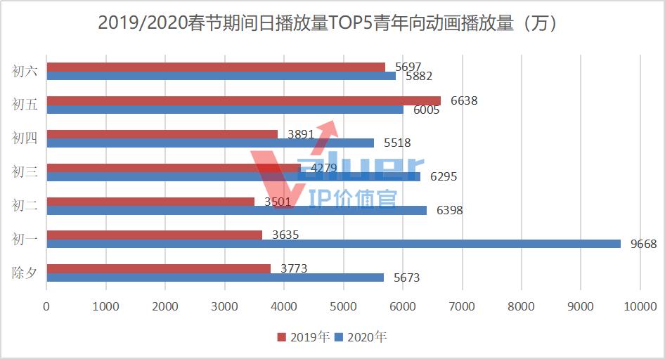 IP价值官统计发现,2020春节期间青年向动画作品播放量迎来暴涨。以日播放量TOP5为例,今年春节青年向动画作品播放量达到4.54亿,2019年同期播放量仅为3.14亿。从日平均播放量来看,今年春节日均播放量1298.26万,且每日都在1000万以上,整体播放平稳。