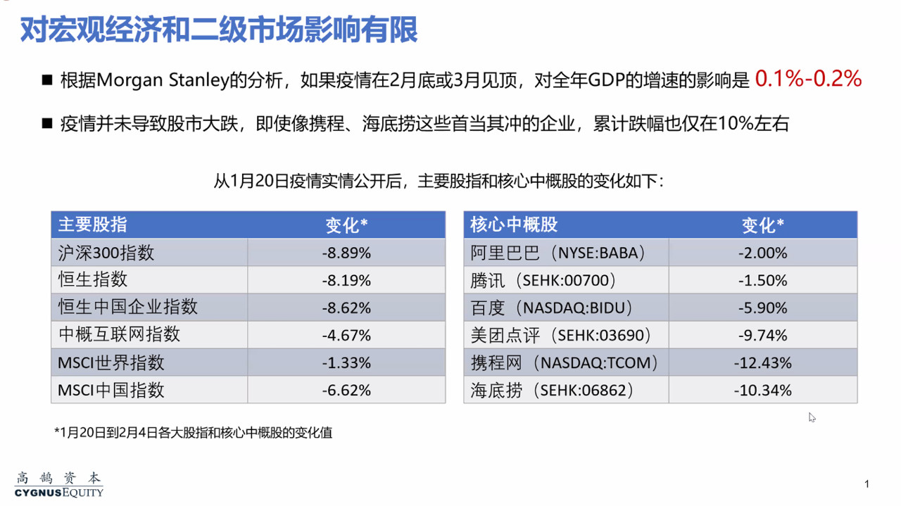 2至3月份大概率会对业绩有影响。春节后数据肯定比较难看,尤其复工以前。方法是抓局部亮点,比如小范围取样。想办法先让投资人来做DD,局部数据可以一定程度证明一旦疫情恢复,公司可能有很强的反弹能力。