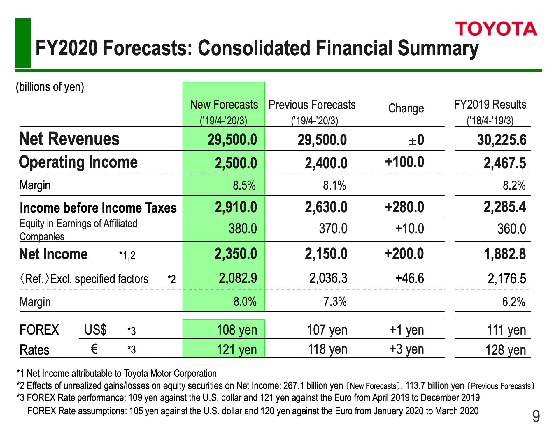同时,丰田汽车调整了2020财年综合财务预测,预计2020财年综合净收入为29.5万亿日元,营业利润2.50万亿日元(约合227亿美元),较此前预期的2.4万亿日元上调4.2%,净利润2.35万亿日元(约合207亿美元),此前预估2.15万亿日元。