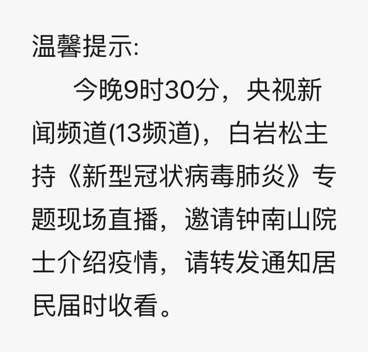 这天晚上9点半,大家都守在电视机前,等着所谓的专题直播。没有如愿看到直播的,还臆测是不是前方疫情加重了,不得不中止了直播计划。一时间,恐慌四起。
