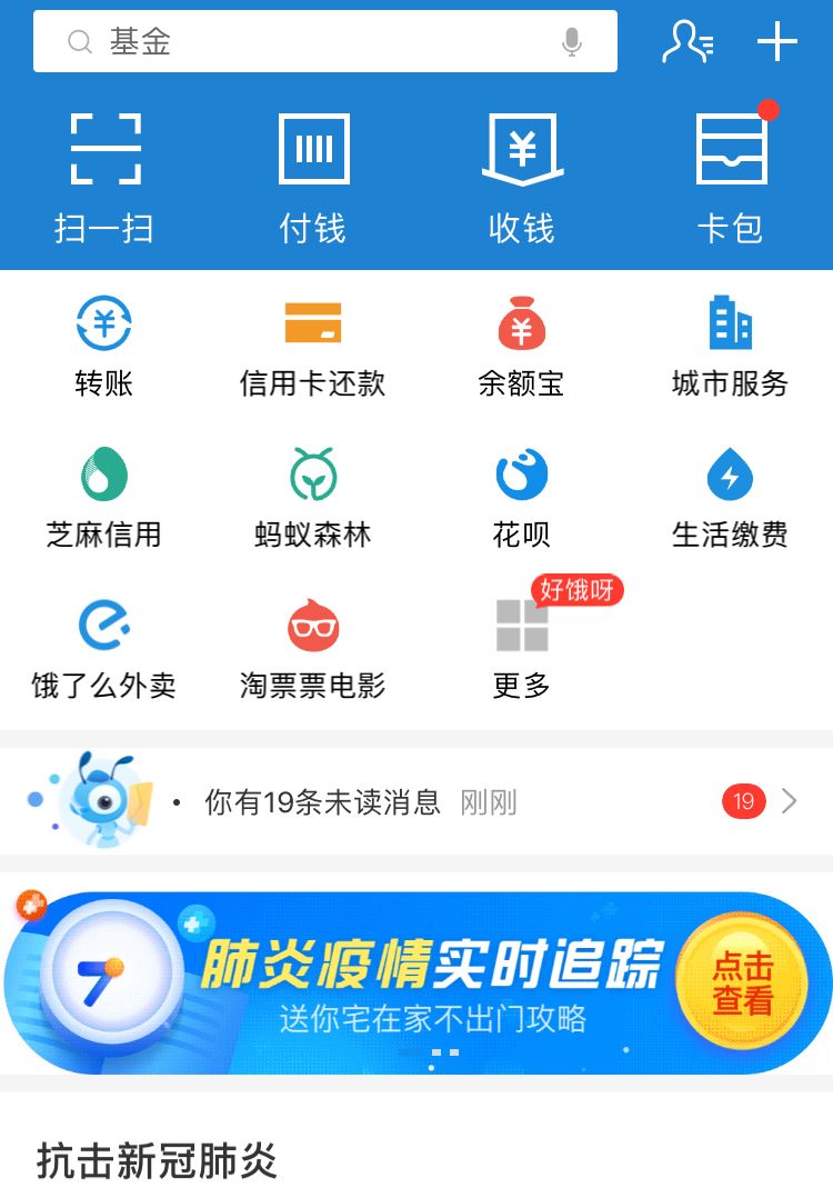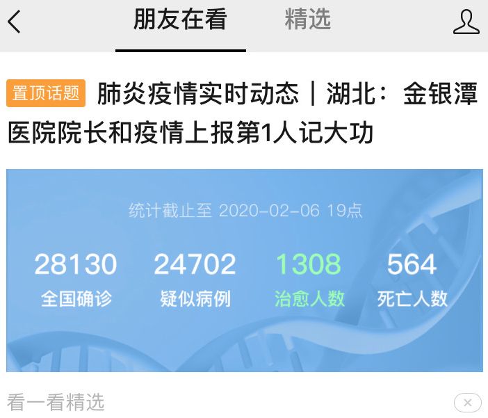 1、疫情实时动态:微信“看一看”里的置顶话题,支付宝首页里的《肺炎疫情实时追踪》。