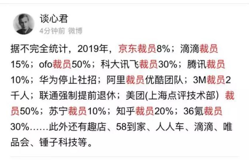 2019年开始,互联网行业迎来寒冬期,包括阿里、腾讯、京东、滴滴等在内的各大互联网公司均开始了不同程度的裁员。马云说“30年后,每年向社会推荐输出至少1000名10年以上的阿里人”;网易“将身患绝症的员工赶出公司”;周鸿祎在年会抽奖设置“免裁券”,将互联网公司裁员潮推至舆论顶峰。