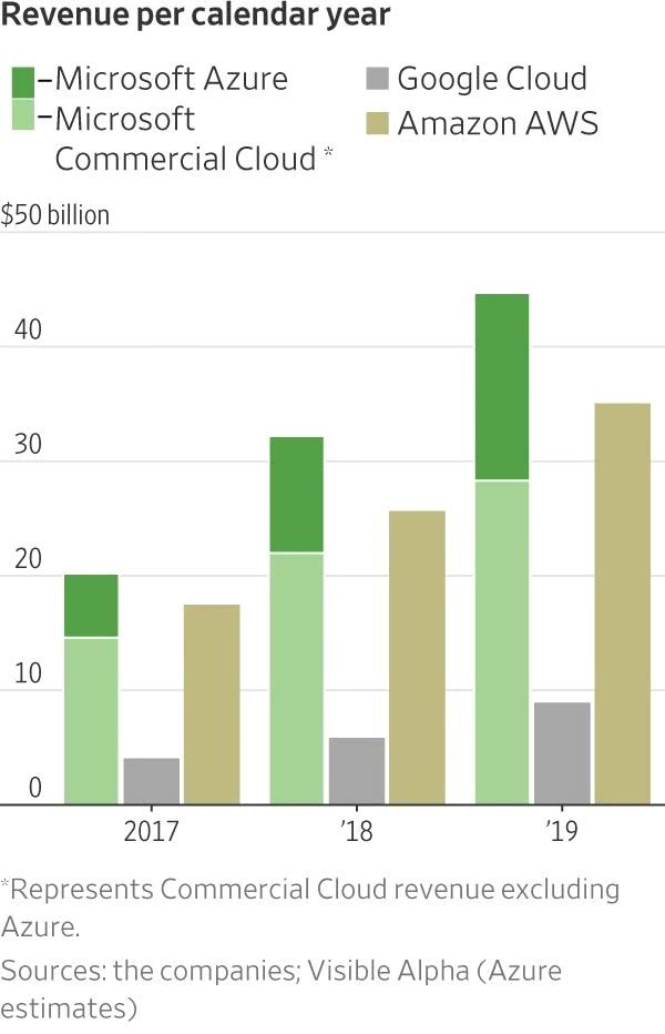 然而,谷歌的云业务营收数据既包括其名为谷歌云平台(GCP)的企业云服务,也包括其G Suite生产力软件,后者涵盖了为企业用户提供的Gmail和Google Docs等服务。从这个角度来看,谷歌云业务与微软的商业云更加相似,后者将Azure云服务与Office 365、LinkedIn和Dynamics的企业部分归为一类。微软2019年的商业云收入为447亿美元,同比增长39%。