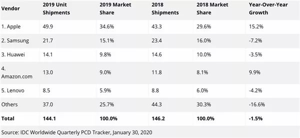 另外,根据IDC的统计,2019年全球平板销量为1.441亿台,苹果卖出了4990万台iPad,拿下了34.6%的市场份额。近年,苹果低价和高端iPad产品齐头并进,试图通过硬件扩大用户群体来增加内容和服务营收。面对这样一块市场,苹果自然也不会轻言放弃。