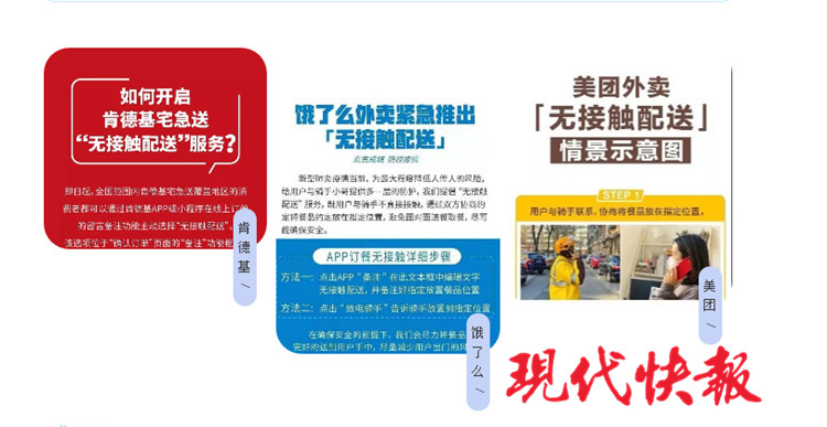 现代快报记者了解到,在南京市市场监管局的倡导下,目前美团外卖、饿了么、盒马、便利蜂等平台和企业相继采用了无接触配送模式,肯德基、必胜客等连锁企业积极开展无接触点取餐试点,对南京保供稳价和食品安全起到了很好的示范引领作用。