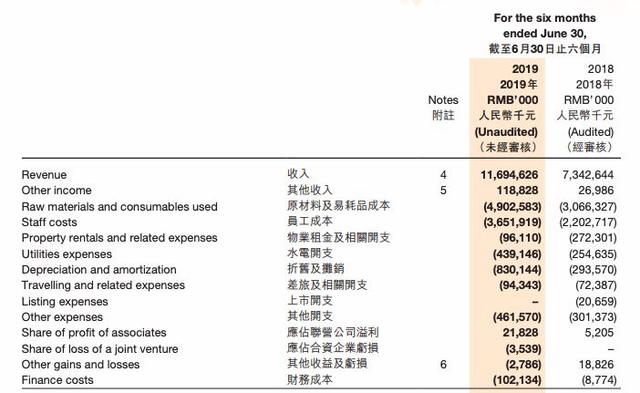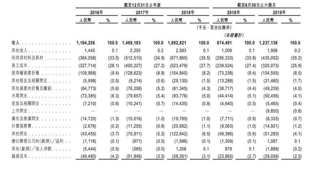 呷哺呷哺2019年上半年的员工成本为7.1亿元,物业租金及相关开支为1.26亿元,分别占收入的26.5%和4.7%。