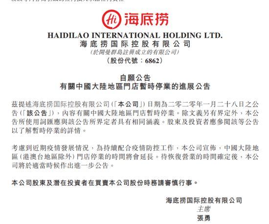 以海底捞为例,其湖北地区的门店自1月23日下午开始暂停营业,随后范围扩大到内地门店于1月26日至31日暂停营业。2月2日,公司再度发布公告称,考虑到疫情发展情况,中国大陆地区门店停业的时间将会延长,恢复营业的时间待确定。