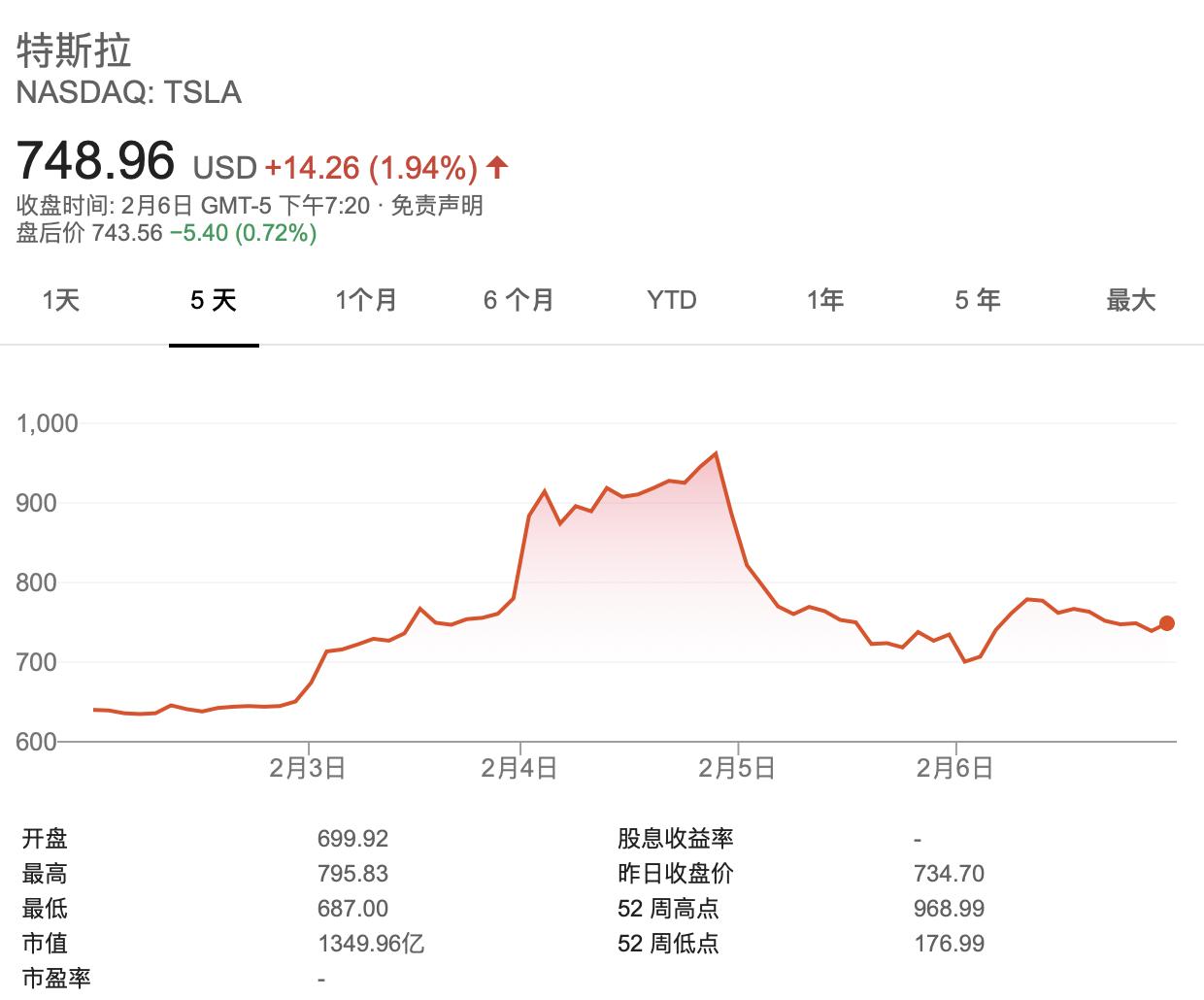 过去一段时间,特斯拉的股价火箭般持续飙升,一度涨至968.99美元,与去年6月的最低点178.97美元相比,至少翻了两番。最高点时,特斯拉市值达到1746.55亿美元,距离全球市值最高的车企丰田(1931亿美元)只有一步之遥,相当于3个通用、4个福特,超过所有A股上市车企的市值总和。