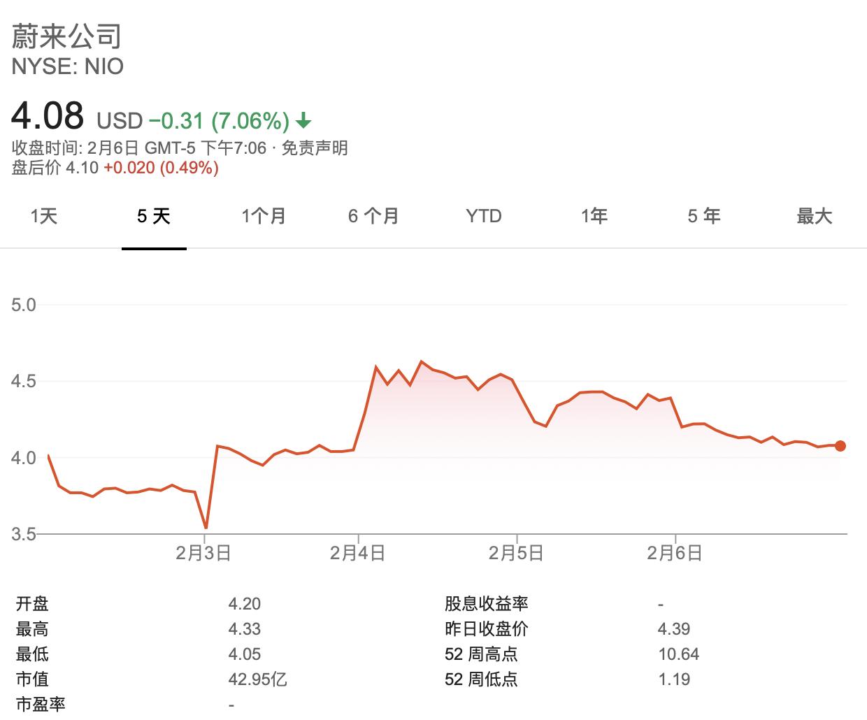 截至发稿,蔚来股价为4.08美元,当日跌幅7.06%。自去年4月以来,这支股票再也没能开盘“破6”。