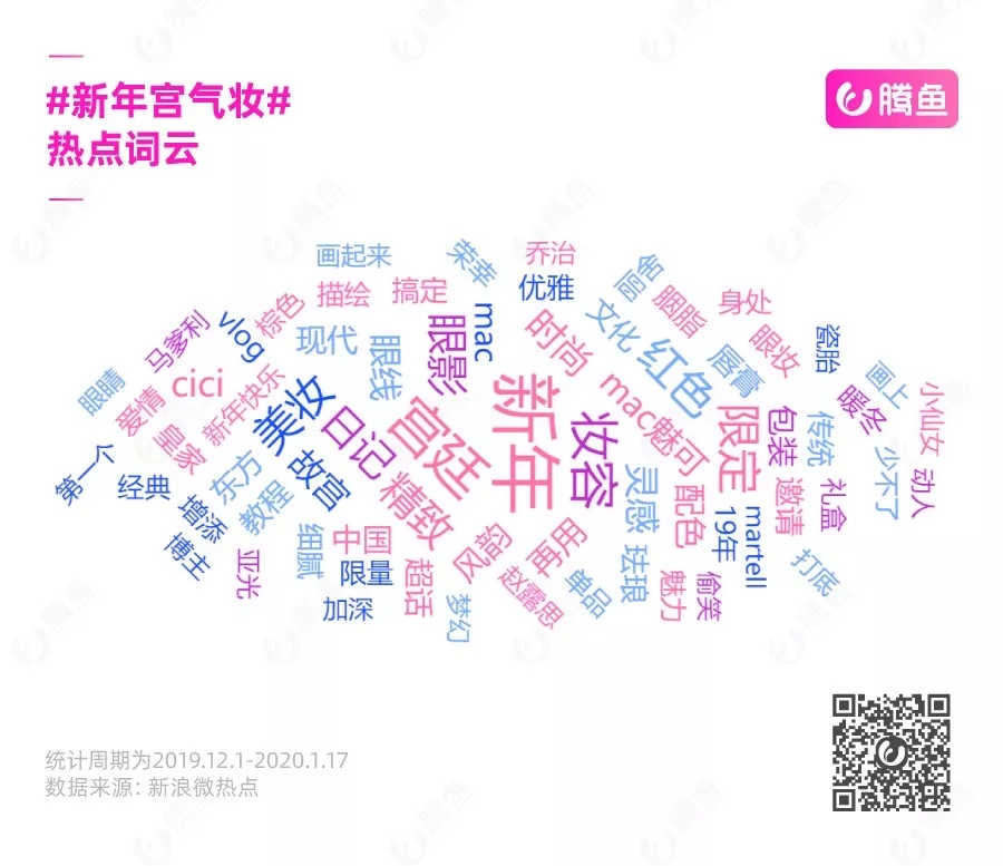 博主们的“新年妆”教学视频,也建立起了用户对新年用魅可打造新年妆容的场景使用认知。在新浪微热点“热点词云”中,“新年”、“中国风”和“东方文化/美学”是网友最感兴趣的内容。