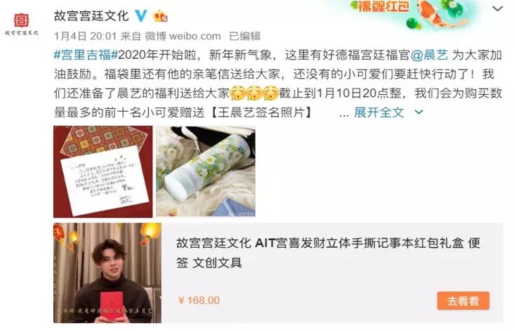 2019年12月,故宫宫廷文化联合近10个品牌推出“宫里吉福”系列商品,一口气邀请了阿云嘎、袁姗姗、王晨艺等10位明星当“宫廷福官”,联合推广商品。