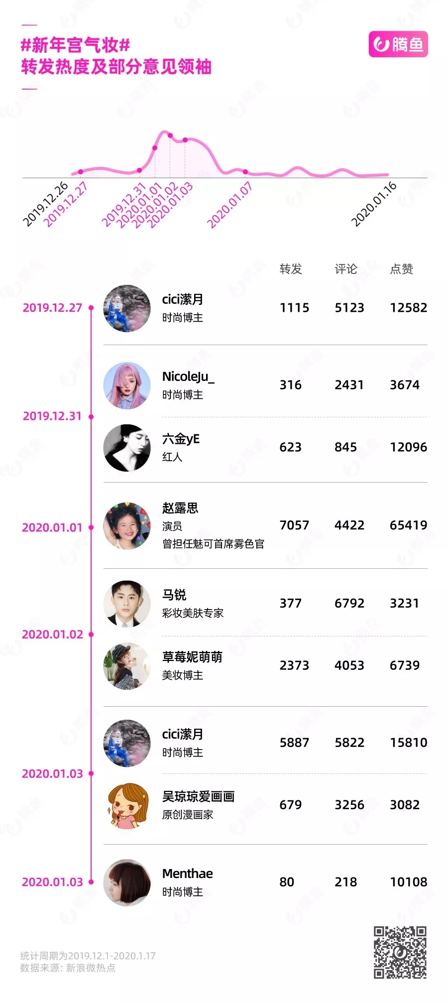在这场话题策划中,明星赵露思和数十位微博博主发挥了意见领袖作用。根据新浪微热点对营销事件的复盘,2019年12月27日,时尚博主cici潆月发了一条美妆教程,话题开始发酵,在几位红人博主的宣传下,话题人气逐渐上升。直到今年1月1日,赵露思上线一条联名款拆箱并试妆的Vlog,话题转发量达到巅峰,结合在淘宝天猫的搜索数据看,这波明星种草操作隔日就引发了大家对联名款的消费热情。