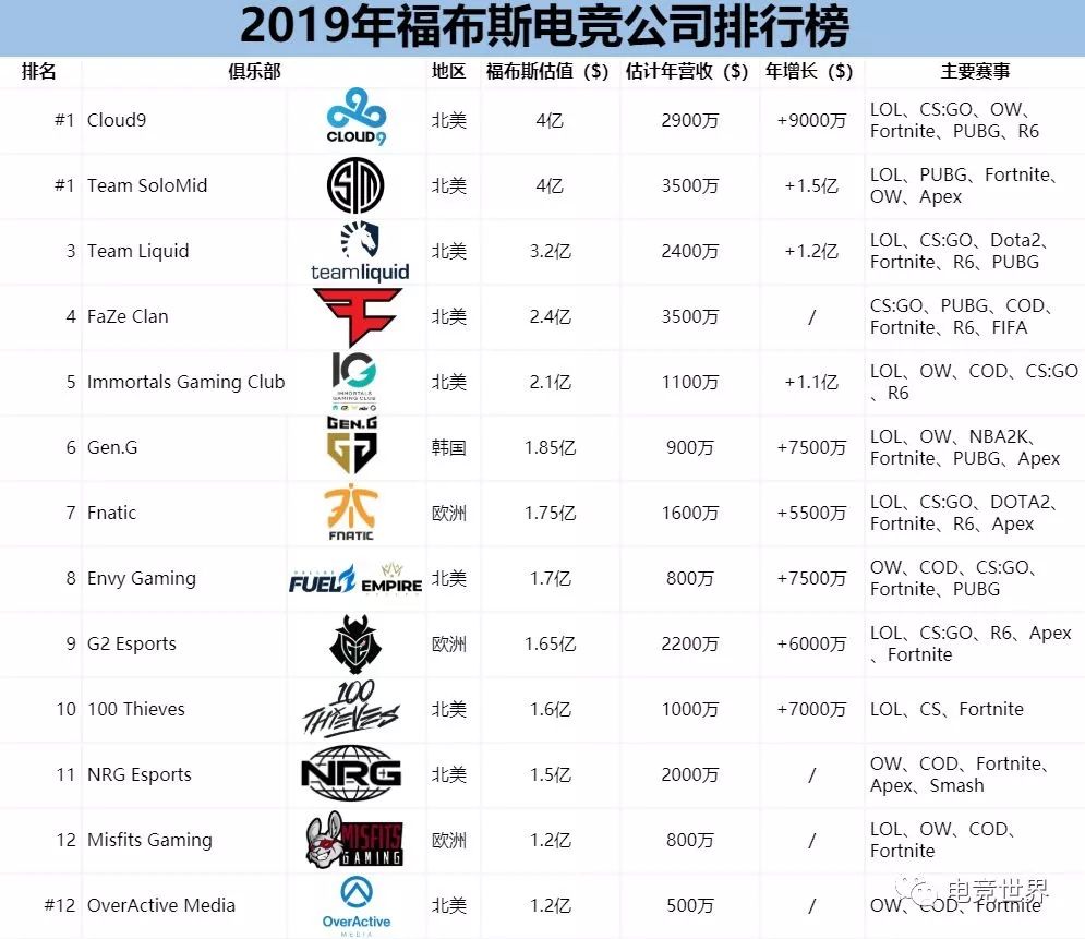2019年11月6日,福布斯公布了2019年的电竞行业公司估值排名其中包括北美、欧洲、韩国在内的共计十三家电竞俱乐部,至于为什么没有来自中国的电竞俱乐部,有的网友说是没统计,有的说是不好统计,但至少从公开的信息来看,中国电竞俱乐部的经营情况普遍不够乐观。