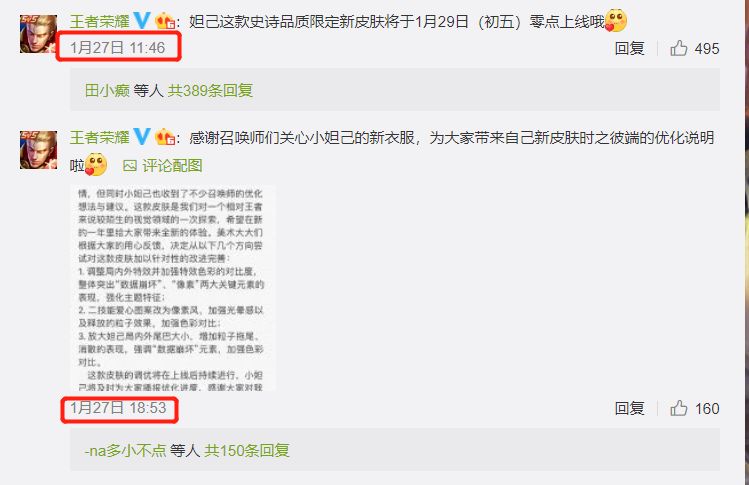1月27日中午,《王者荣耀》官博发布了一款新皮肤的预告视频,不料收到了一些负面评价:“太丑了”“回炉重做”。尽管负面的声音并不算多,《王者荣耀》团队还是于当天傍晚宣布,将重新优化这款皮肤。