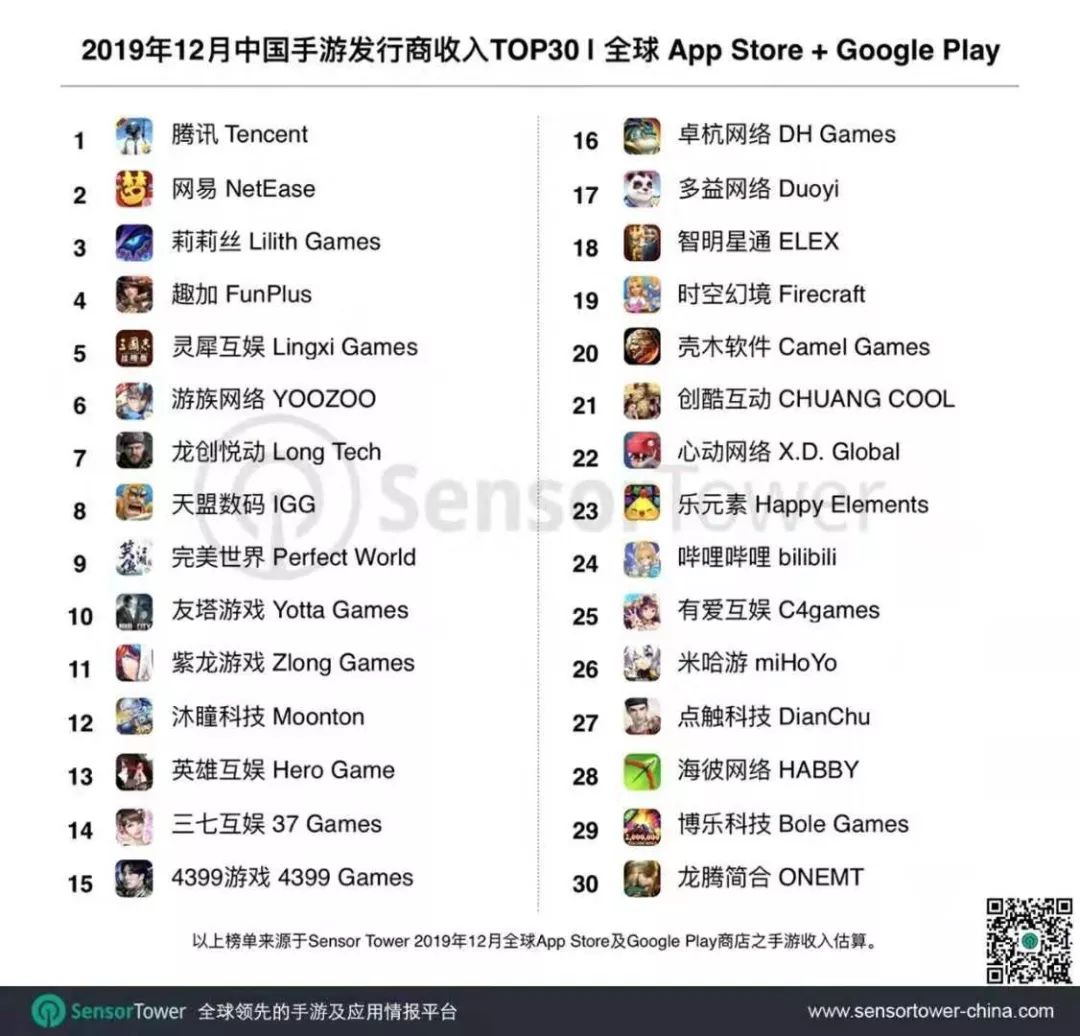让我们做一个对比。根据Sensor Tower的报告,2019年12月,Top30的中国游戏公司在海外的总收入是14.9亿美元,换算成人民币大约是100亿元,占当期全球手游总收入26.9%。《王者荣耀》一款产品,只花了仅仅一天,就赚了30家顶流游戏公司一个月海外收入的五分之一。