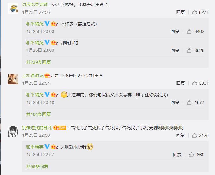 “数以亿计”的玩家同时涌入游戏,导致登陆界面出现异常,部分玩家迟迟无法登陆游戏。“快点搞,我这几天就靠《王者(荣耀)》活了,在家快无聊死了。”这是官博帖子下点赞数最高的一条评论。话题“王者荣耀”也一并登上了微博热搜,夹杂在一堆疫情新闻中,格外显眼。