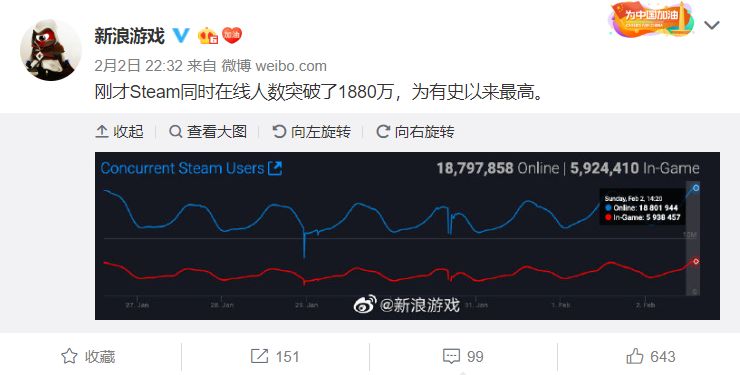 2月2日晚上10点30分左右,PC游戏平台Steam的同时在线突破了1880万,破了以往同时在线人数的最高记录。