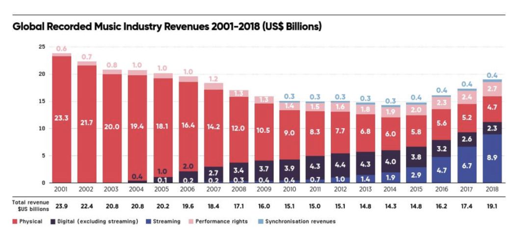 2010-2018全球录制音乐产业收入,来自IFPI,2019.4
